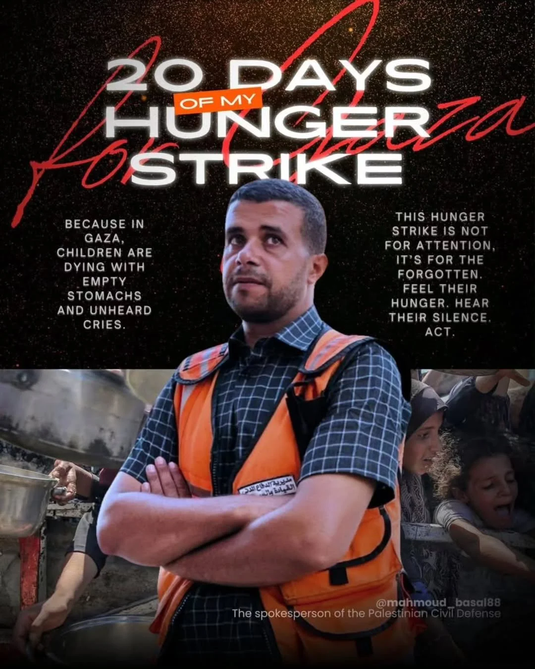 Ondertussen is Mahmoud Basal, woordvoerder van de Palestijnse Civiele Bescherming, op dag 21 van zijn hongerstaking tegen de geforceerde uithongering en genocide door Israel. Journalist Wadea Abu al-Saoud vecht voor het leven van zijn vrouw die het snel-dodende zeldzame Guillain-Barre Syndroom heeft waarvoor geen behandeling is in Gaza. Kijk en deel vooral ook zijn noodkreet.