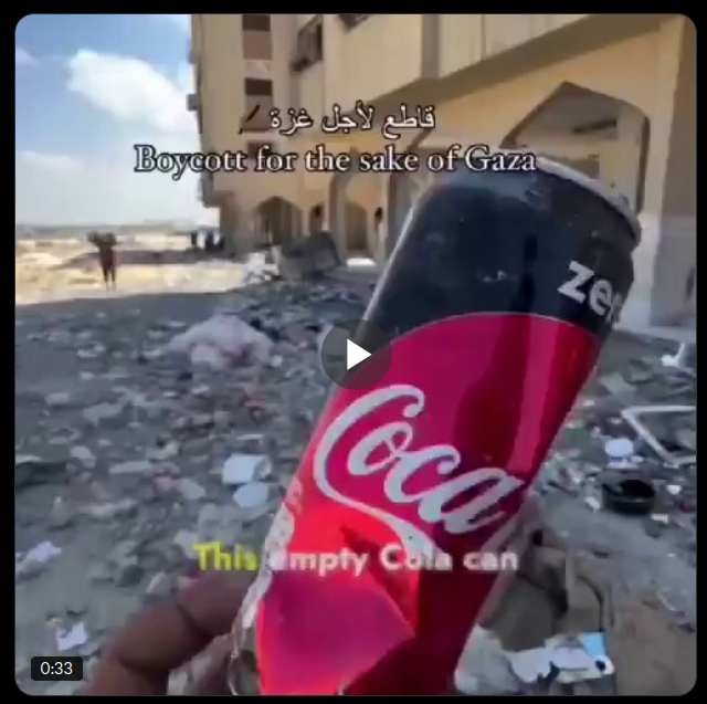 In een filmpje op social media laat Bisan Owda een leeg Coca-Cola blikje zien tussen de lege kogel hulzen op een plek waar soldaten van het bezettingsleger op Palestijnen hebben zitten schieten. Ook andere Palestijnse organisaties roepen op geen Coca-Cola meer te kopen en drinken, laten we daar gehoor aan geven.