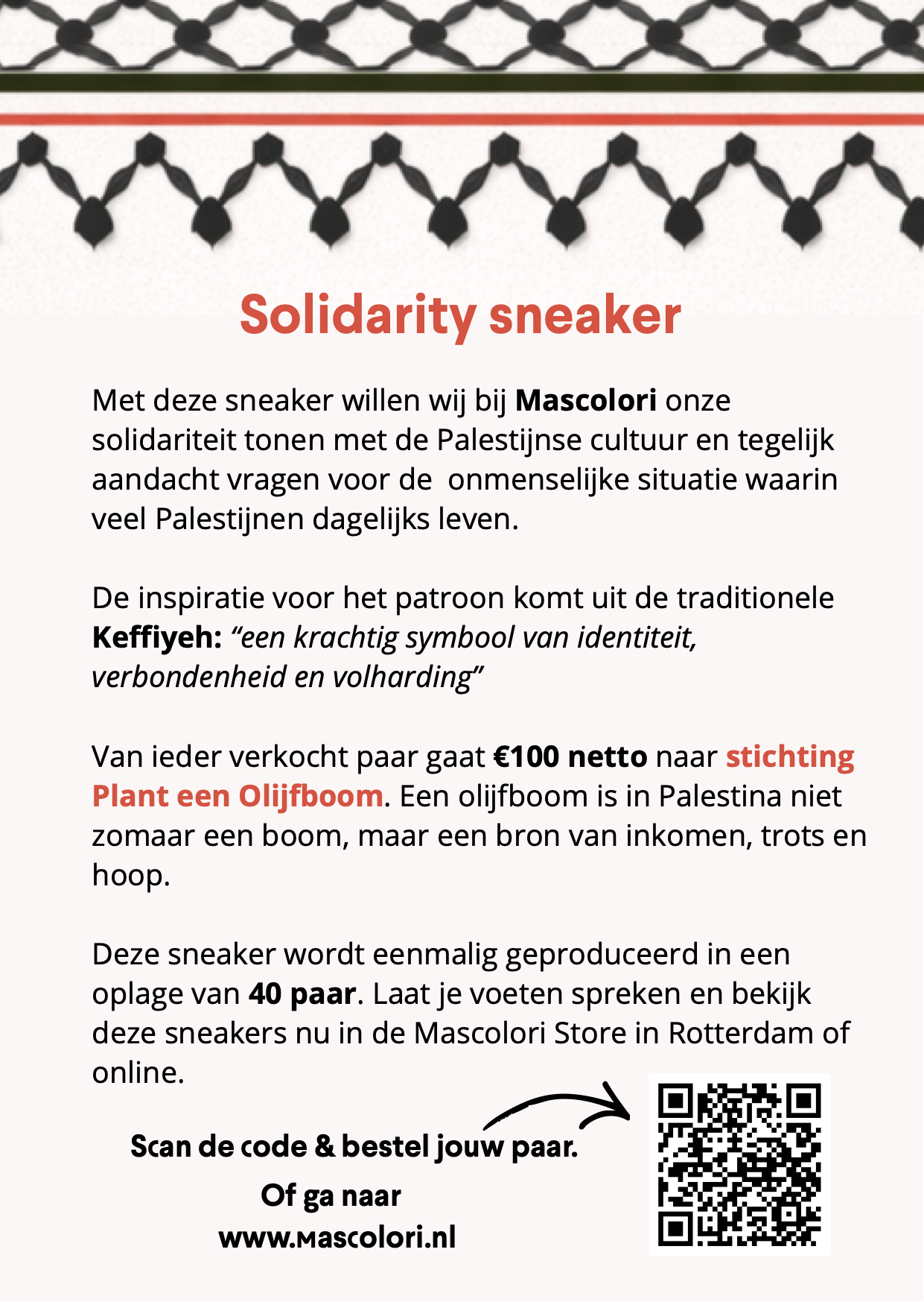 Mascolori (het meest bijzondere schoenenmerk uit Rotterdam) lanceert in maart een bijzondere limited edition sneaker, geïnspireerd op het iconische keffiyeh-patroon. Een ontwerp dat staat voor identiteit, verbondenheid en veerkracht.