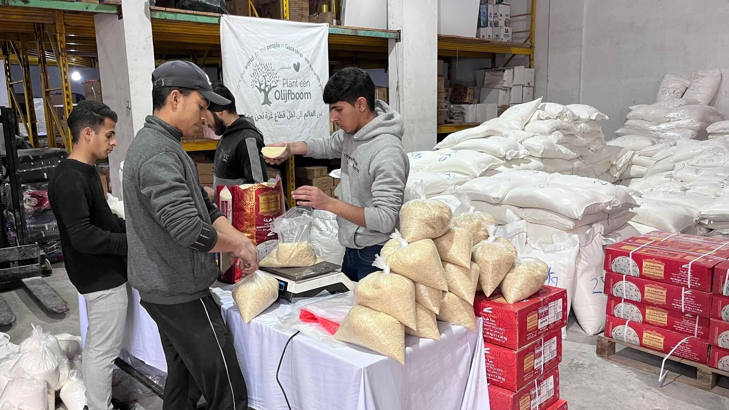 Het is enorm belangrijk nu de grenzen dicht zijn om basisproducten uit te delen. Tijdens de Ramadan geven moslims Zakaat al-Fitr. Dat is een vaste gift voor iedere moslim om ervoor te zorgen dat iedereen een fijne Eid al-Fitr kan hebben, ook als zij zelf geen geld hebben om voldoende eten te kopen. In Gaza zijn heel veel mensen die door de genocide arm en behoeftig zijn geworden. Daarom delen we - voordat het Eid gebed gebeden wordt - rijst en meel uit namens mensen die hun Zakaat al-Fitr hebben afgedragen en ook met een deel vanuit de reguliere donaties aan het Palestina Fonds. Want we hebben een grote hoeveelheid aangekocht net voordat de grenzen sloten. Namelijk 15.000kg rijst en 15.000kg meel.